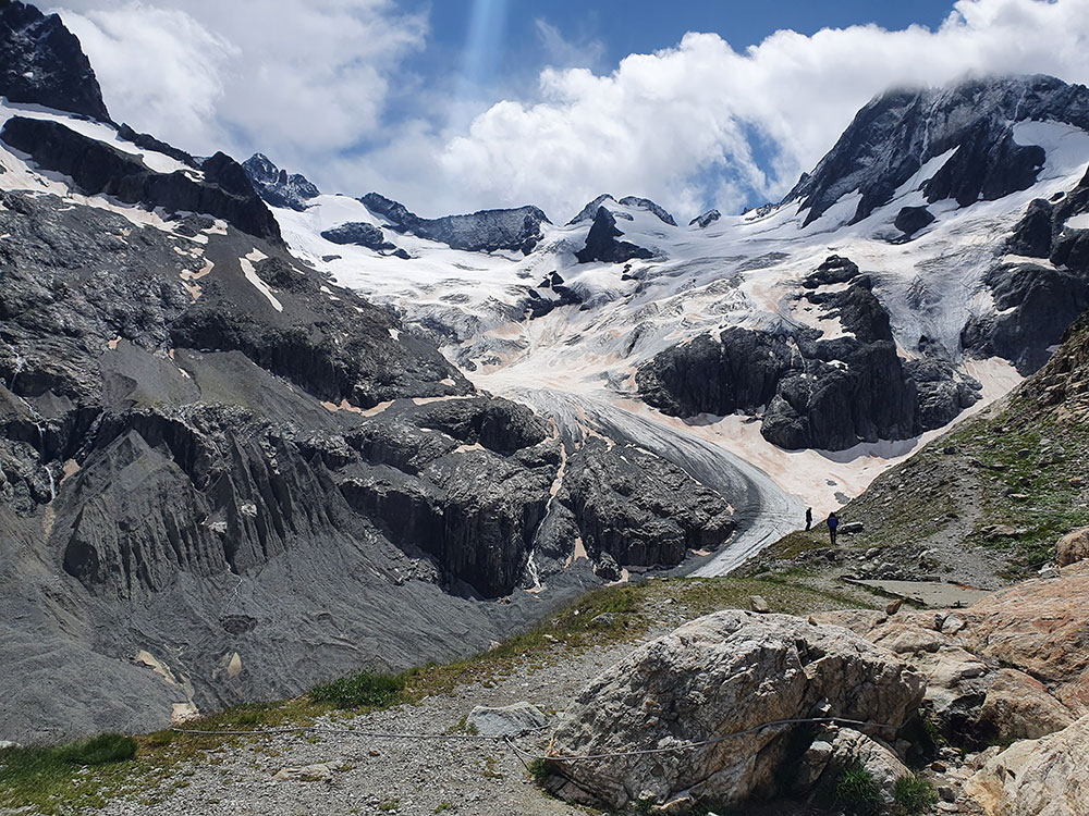 [La situazione geologica del poggio sul quale sorge il Rifugio de la Pilatte. Si noti nell’immagine a destra il continuo e drastico decremento del livello del ghiacciaio, che ancora a fine Ottocento si trovava all’altezza della posizione del rifugio. Immagine tratta da www.montagnes-magazine.com.]Le montagne stanno cambiando, e in forza di fenomeni la cui velocità – inopinatamente alta – è legata al tempo dell’uomo più che al tempo della Terra, rimarcando l’origine antropica di ciò che sta accadendo. I rifugi, essendo sulle montagne come null’altra cosa costruita dall’uomo, potrebbero essere i primi a subire le conseguenze più materialmente evidenti del cambiamento (climatico, ambientale e ancor più geomorfologico e paesaggistico) in corso. Come scrive la Cipra / Commissione Internazionale per la Protezione della Regione Alpina nel proprio sito, «I rifugi svolgono un ruolo centrale nel turismo alpino. Il loro futuro è tuttavia ricco di incognite: la necessità di interventi di ristrutturazione, la crisi climatica e il cambiamento delle abitudini delle e degli utenti sono solo alcune delle sfide da affrontare. Il mantenimento dei rifugi è possibile solo attraverso una gestione ecologica e il riconoscimento della loro importanza da parte della politica e della società.»