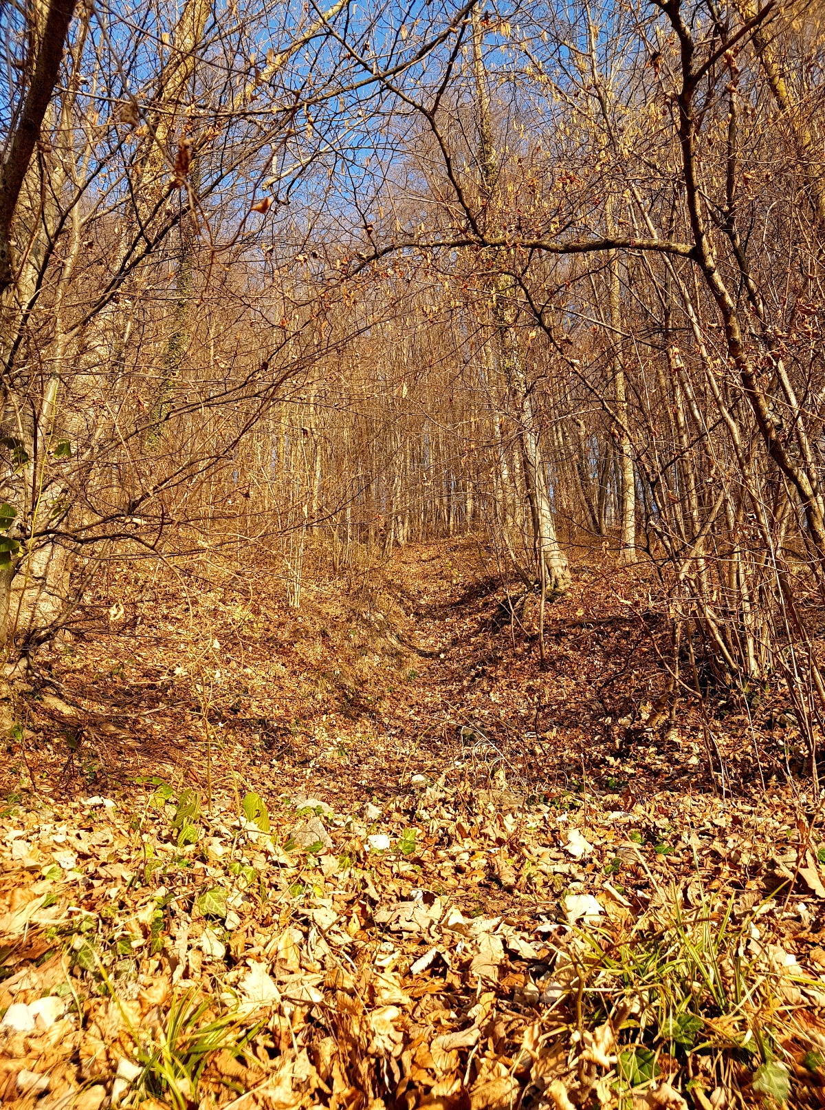 Gironzolare per i luoghi vicino casa anche solo per fare una rilassante passeggiata, ma senza mai abbandonare uno spirito curioso e mantenendo i sensi ben attivi, ti fa ribadire ogni volta la peculiare bellezza del paesaggio e ti può regalare piccole/grandi sorprese, anche quando di quei luoghi domestici pensi di sapere ormai tutto. D’altro canto i paesaggi sono libri aperti che narrano innumerevoli storie, scritte da chi li ha vissuti nel tempo su altrettante pagine: a volte sono “testi” ben leggibili, altre sono come messaggi scritti con un inchiostro simpatico per la cui lettura servono condizioni particolari. Così, ecco che nel bosco d’inverno, spoglio e privo di fogliame, torna visibile quello che a tutti gli effetti – visto il suo andamento rettilineo e il profilo regolare – sembra* essere stato un canale artificiale di scarico del legname che mai avevo notato prima, lungo il quale i tronchi abbattuti nella faggeta soprastante venivano fatti scivolare a valle grazie alla copertura del fondo del canale con lamiere o altre superfici lisce oppure semplicemente per gravità: