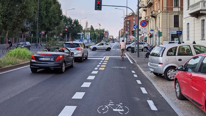 [Una bike lane in mezzo al traffico a Milano: quanto di più pericoloso vi sia per i ciclisti. Immagine tratta da bikeitalia.it.]