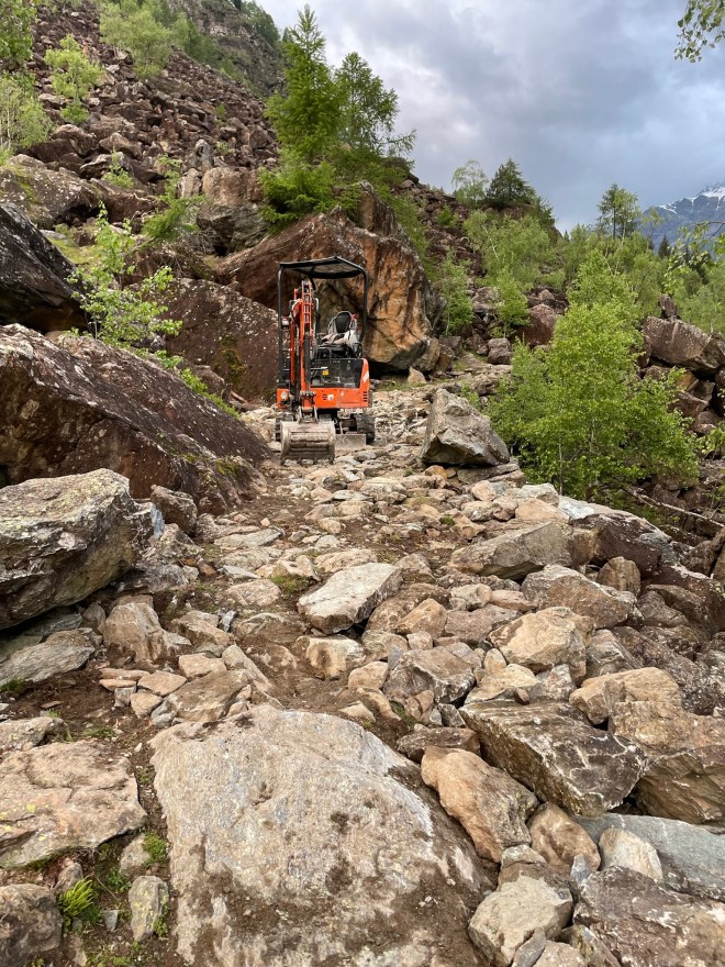 Nella foto, di Michele Comi: la distruzione a colpi di escavatore dell’antica Cavallera del Muretto, in Valmalenco, per livellarne la superficie ad uso meramente cicloturistico. Che le mie parole qui espresse servano anche a rendere ancora più chiare quelle espresse da Comi a corredo dell’immagine.