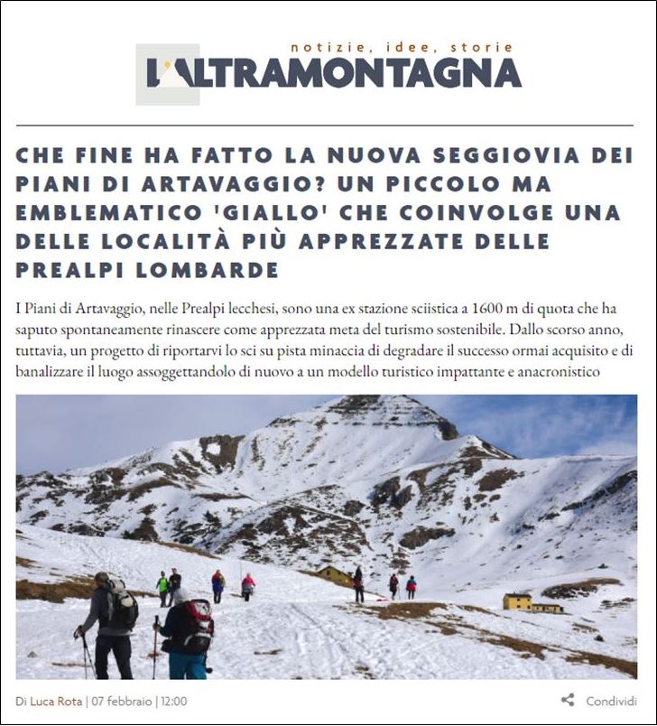 Nei mesi scorsi numerose associazioni e tanti cittadini si sono mobilitati, anche con eventi in loco, contro il paventato progetto di una nuova seggiovia – con relativo impianto di innevamento artificiale – ai Piani di Artavaggio, affascinante località della Valsassina (provincia di Lecco, Prealpi Lombarde) tra i 1600 e i 2000 m di quota dalla storia alquanto emblematica.