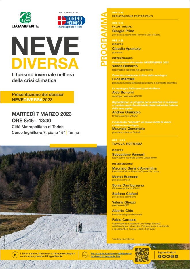 Avete letto qui sopra qualche passaggio dal comunicato stampa relativo alla presentazione – avvenuta ieri, martedì 7 marzo a Torino – del report Neve Diversa 2023. Il turismo invernale nell’era della crisi climatica, come sempre curato da Legambiente. Vanda Bonardo, che nella sua veste di Responsabile Alpi per l’associazione