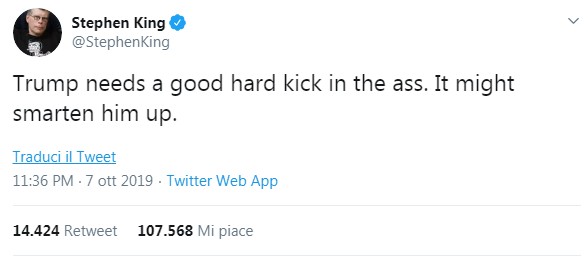 Così ha scritto ieri Stephen King sul suo profilo Twitter.