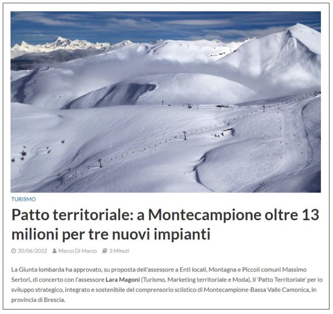 [Tratto da sciaremag.com, 30/06/2022.]EVVIVA! Stanziati altri tot milioni di Euro per nuovi impianti sciistici, per l’innevamento artificiale, per il turismo sciistico! Evitiamo lo spopolamento, sviluppiamo l’economia montana, aiutiamo i paesi delle valli alpine e i loro residenti! Salviamo le montagne, sììììììì!!!