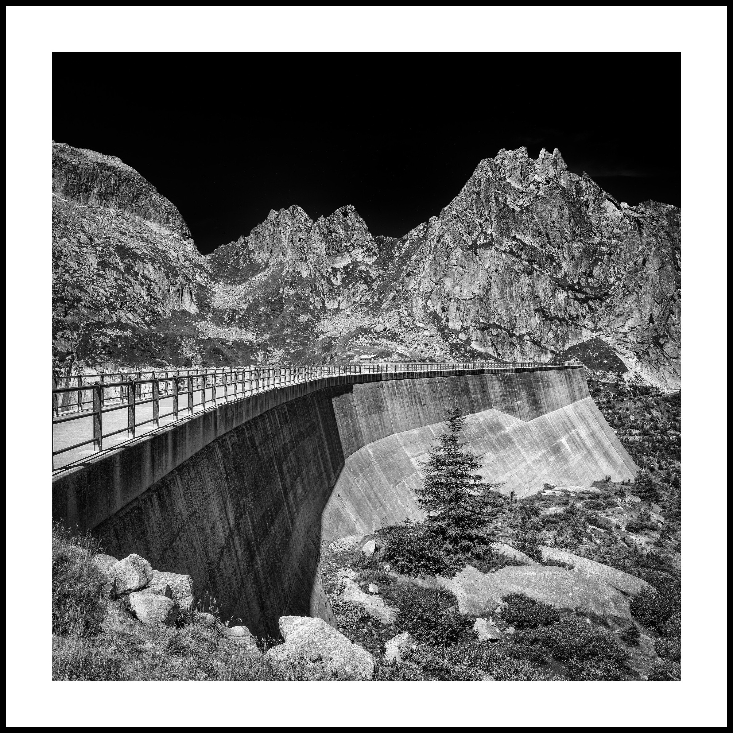 Ancora un’originale visione fotografica di Cesare Martinato, un’altra veduta della diga dell’Albigna, in Canton Grigioni, una delle più particolari dighe delle Alpi, posta sul ciglio di una parete quasi verticale sospesa mille metri sopra l’alta Val Bregaglia e circondata dalle spettacolari guglie granitiche di questa regione delle Alpi Retiche occidentali – quelle visibili nell’immagine proprio sopra il muro della diga possiedono i pittoreschi oronimi di Spazzacaldeira e Fiamma.