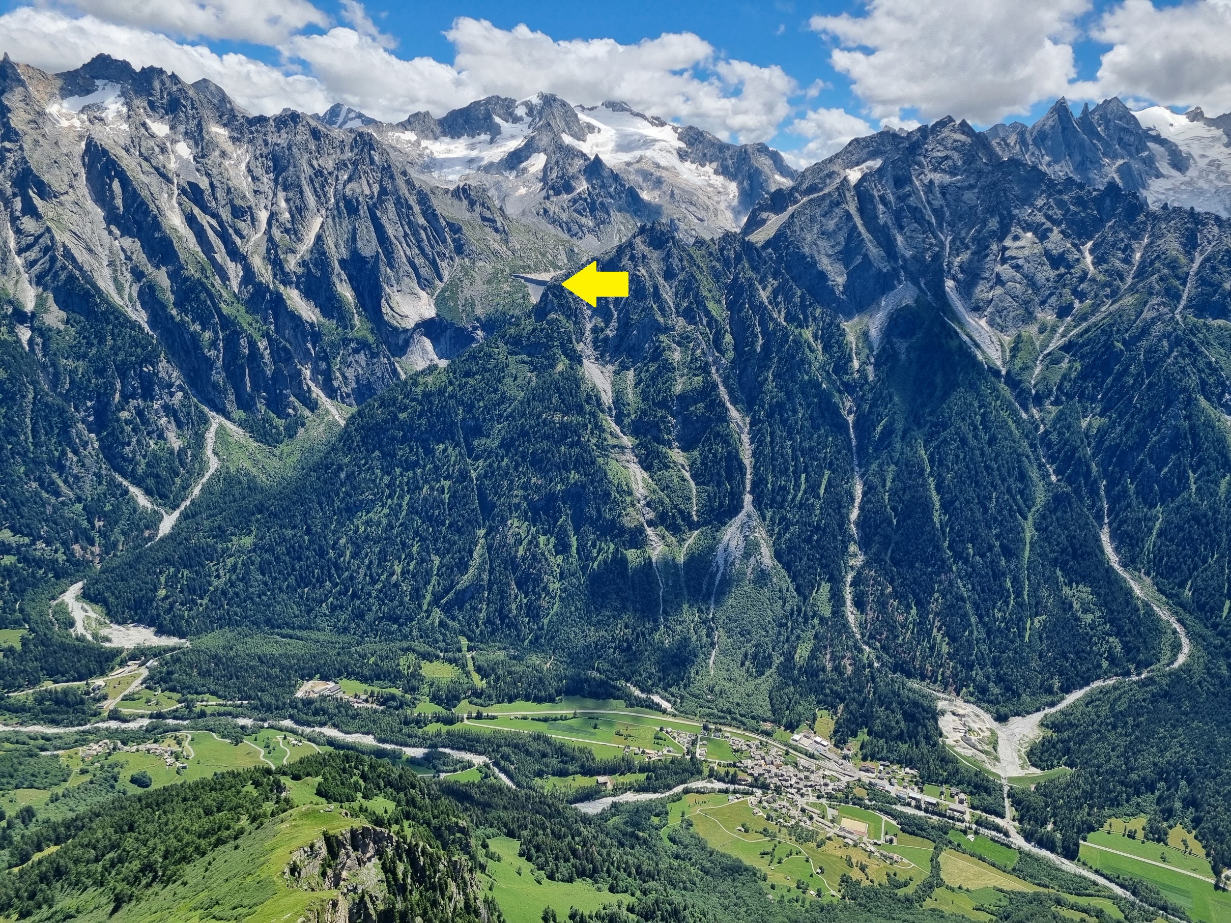 [Veduta da nord della Val Bregaglia con nel fondovalle il villaggio di Vicosoprano e, indicata dalla freccia gialla, la diga dell’Albigna, della quale se ne vede una parte. Foto di Staublex, opera propria, CC BY-SA 4.0, fonte commons.wikimedia.org.]L’argomento, sull’onda dei fatti bellici relativi alla distruzione della diga di Nova Kakhovka in Ucraina ad opera dell’esercito russo, è stato trattato di recente da un articolo del canale d’informazione svizzero “Tio.ch” chiedendo il parere di un esperto del settore e richiamando alcuni interessanti documenti della Confederazione Elvetica al riguardo; da tale articolo ho tratto la citazione che avete letto in principio di questo post la cui fonte originaria è l’UFPP – Ufficio Federale della Protezione della Popolazione. Leggendolo mi sono tornati in mente certi ricordi di me bambino per ciò che osservavo a valle della grande diga di Albigna, in Val Bregaglia (Canton Grigioni, Svizzera), quando a bordo dell’auto di mamma e papà si risaliva la strada che da Chiavenna attraverso il Passo del Maloja porta alle piste da sci engadinesi. Quella di Albigna è una delle dighe alpine più impressionanti da ammirare, essendo piazzata sul ciglio di un versante scosceso mille metri sopra il fondovalle, e dai finestrini dell’auto la osservavo ammirato tanto quanto intimorito per tutto il tragitto stradale che ne consente la visione, all’andata e al ritorno, confidando che se ne restasse lì ben ferma e salda e non scivolasse a valle spinta dalla massa d’acqua del grande lago (ben 70 milioni di m3) trattenuto lassù. Tuttavia, prima di arrivare in vista della diga, a nutrire la mia curiosità era la visione, sui tetti dei villaggi posti lungo lo strada della Bregaglia a valle dello sbarramento, di alcuni grandi altoparlanti posti in modo da dominare le case: proprio quelli delle sirene di allarme citate nell’articolo. Peraltro già allora, pur nella mia ingenuità bambinesca, mi chiedevo quanto tempo effettivo, al suono dell’allarme, gli abitanti di quei villaggi potessero avere prima che l’onda d’acqua fuoriuscita dalla diga che avesse tragicamente ceduto spazzasse via ogni cosa. Calcolata sulla mappa, la distanza tra la diga e Vicosoprano, il primo centro abitato di una certa importanza (445 abitanti) a valle è di circa 5 km, il che equivale a un tempo di 3 o 4 minuti, più o meno, prima dell’arrivo dell’onda: in effetti pochissimi per mettersi in salvo fuggendo dal fondovalle per risalirne il più possibile i fianchi al fine di togliersi dal volume d’acqua. L’affermazione che «Il tempo di preallarme è molto breve» citata dall’UFPP svizzero suona parecchio eufemistica.